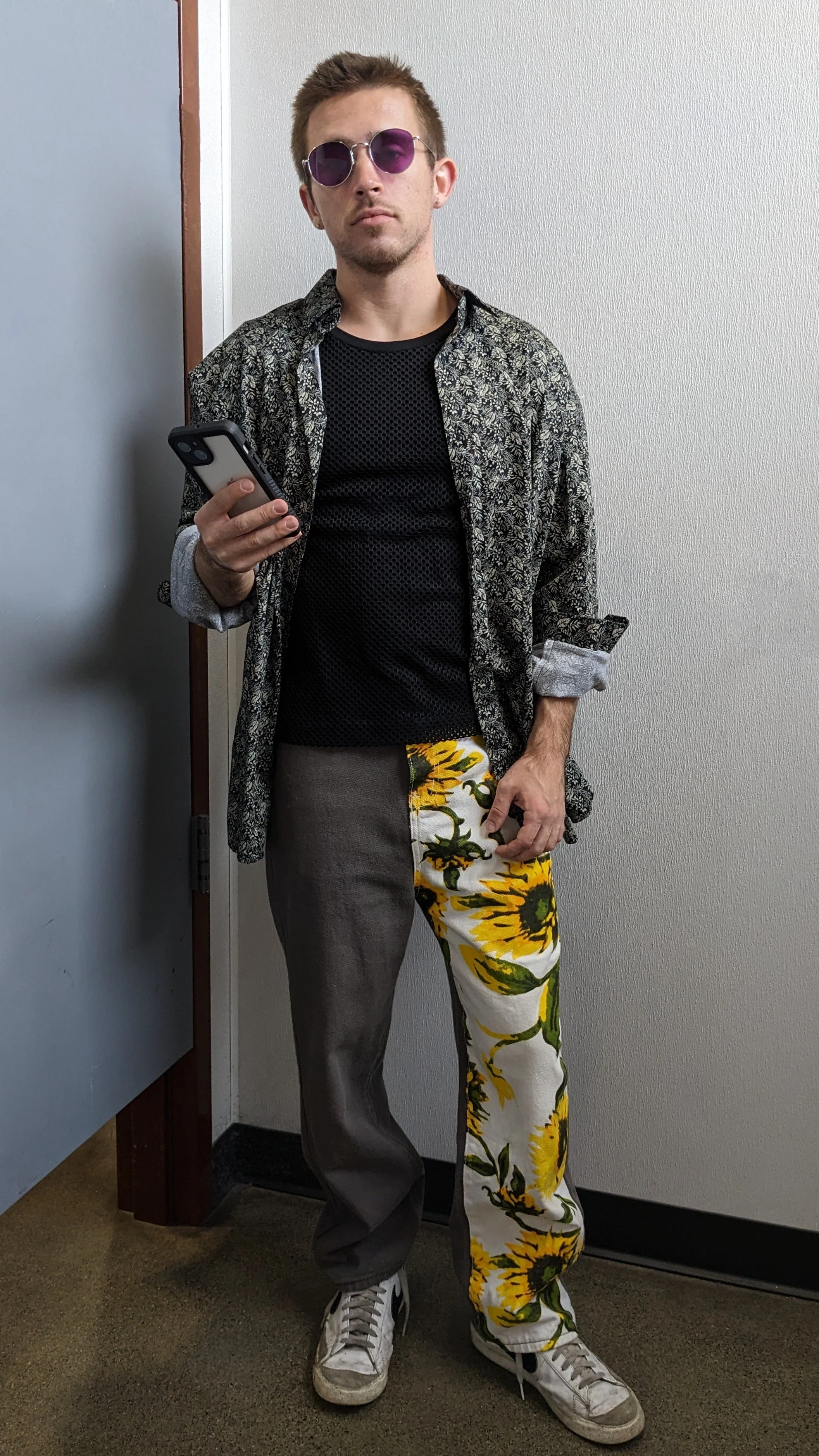 Sweetheart professor Alec invited me to thrift with them one Sunday. Can you believe how this 45-minute Goodwill shopping trip had him walking out looking like a queer Brad Pitt? I just adore these half sunflower jeans on them.