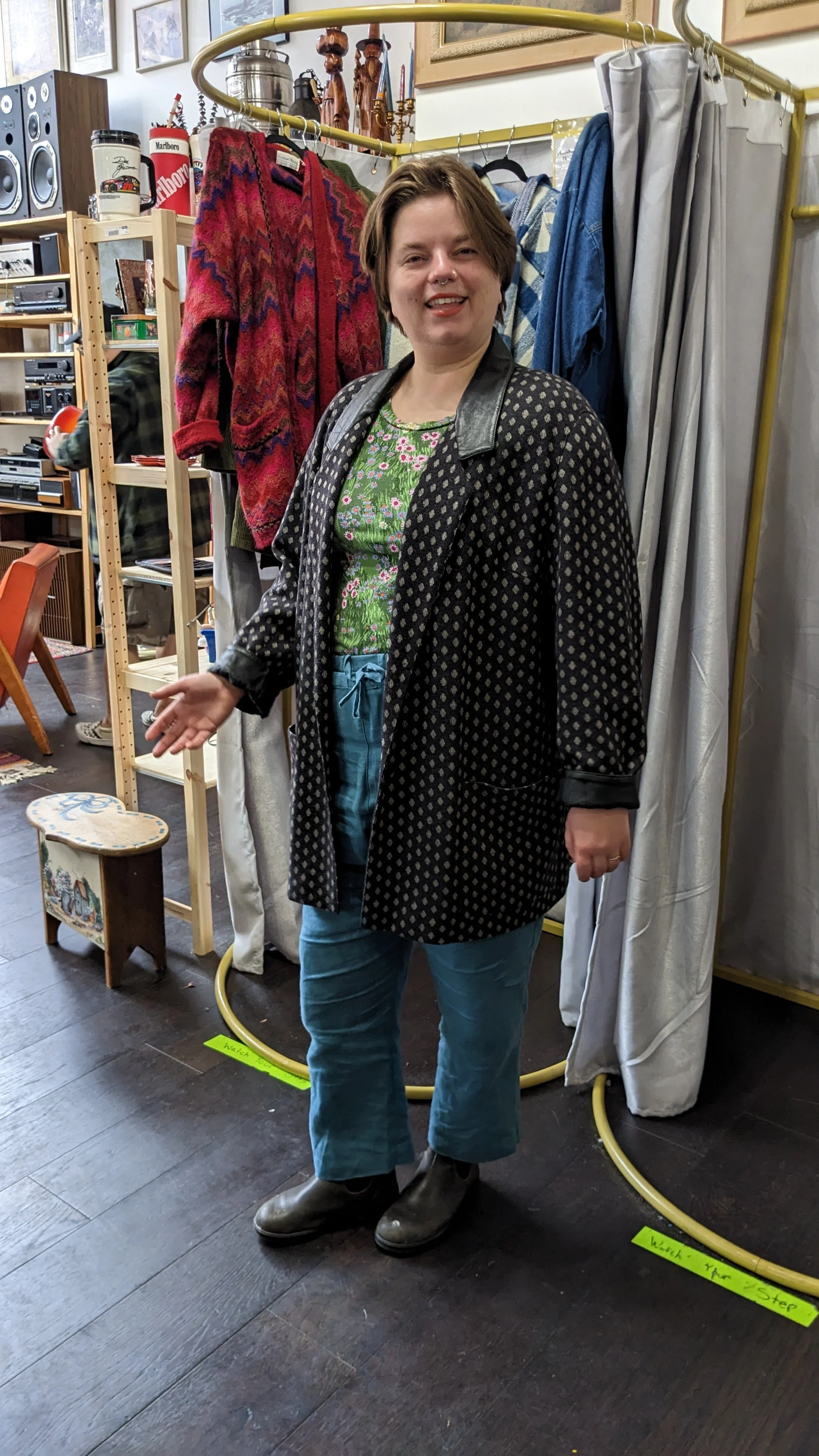 Shana devours patterns for breakfast, lunch and dinner. A bright and printed closet called for layers that allow her prints to stand out. This vintage jacket will be great for a chilly office, and the neutral colors and geometric shapes help the patterns mix without competing.