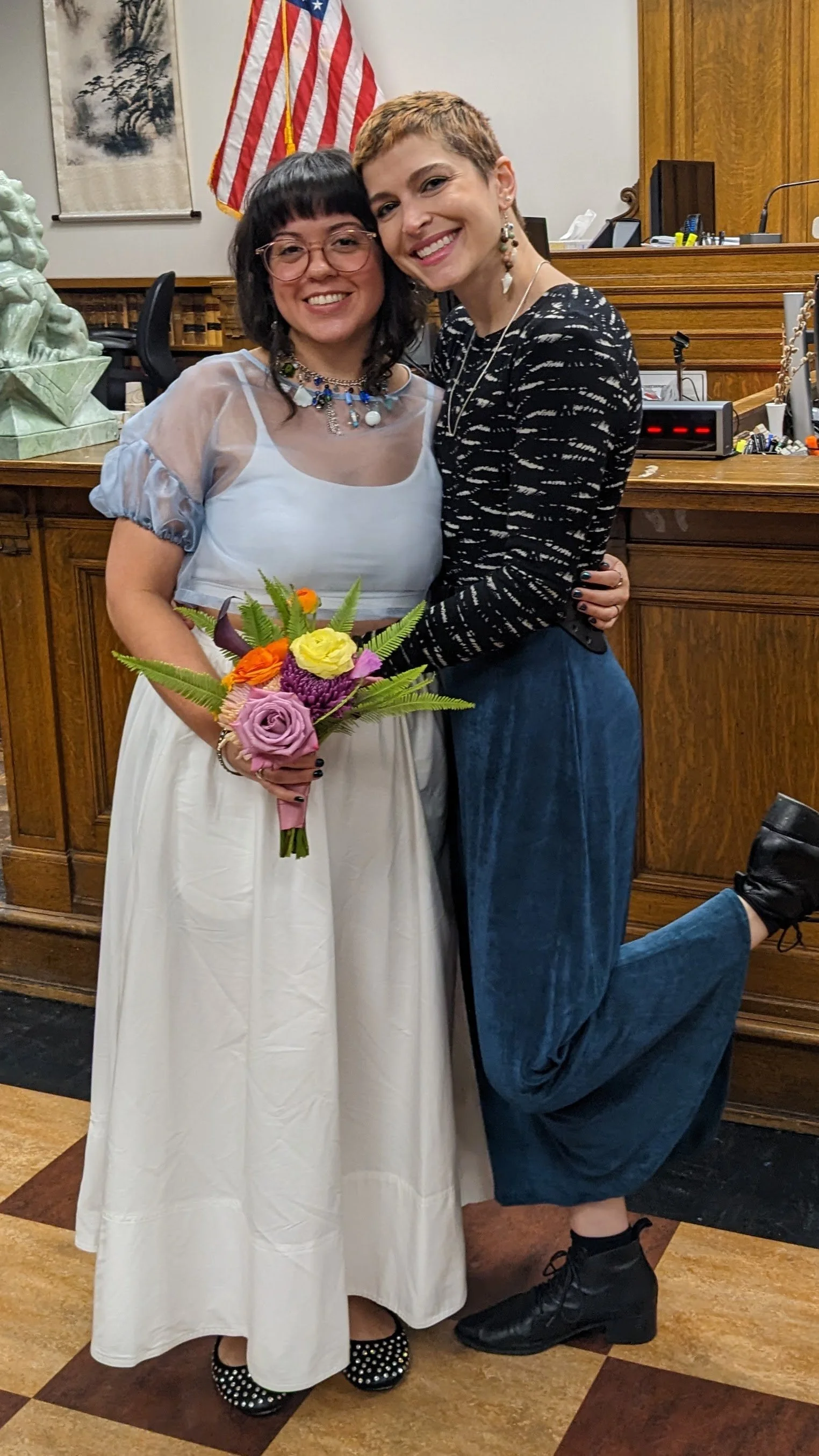 Maria inspires me. She sews her own clothing often, and here we were searching for her unique wedding look. She made her own top and necklace. I advised on purchasing the skirt, how to layer, and chose the flowers to complement. The final look was so her.