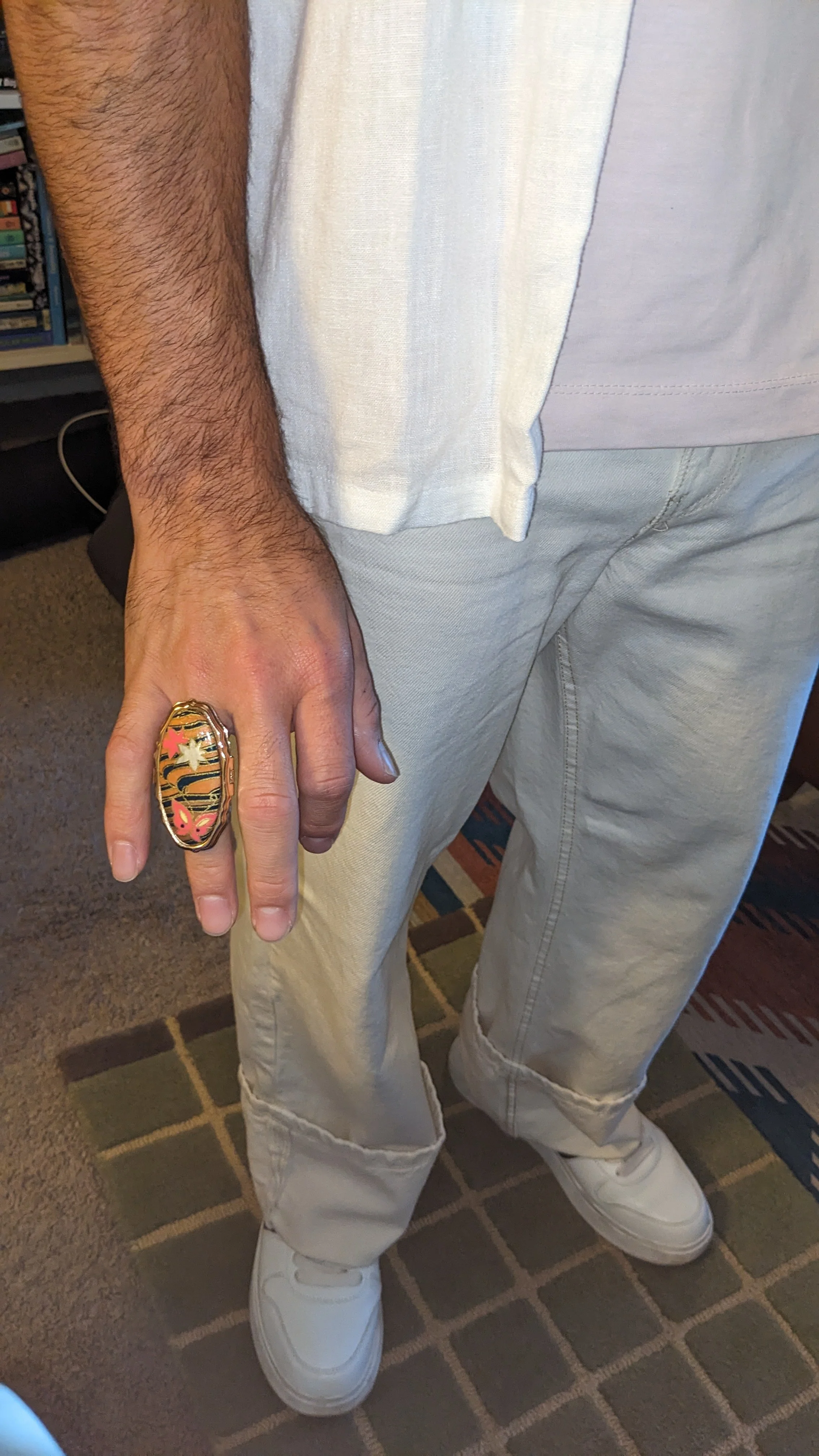 My clients often have exactly what the look needs already in their closet or jewelry box. Check out this rad enamel ring and how it sets off a pink/white/beige monochrome look. Adorable, there’s even a hidden mirror inside.
