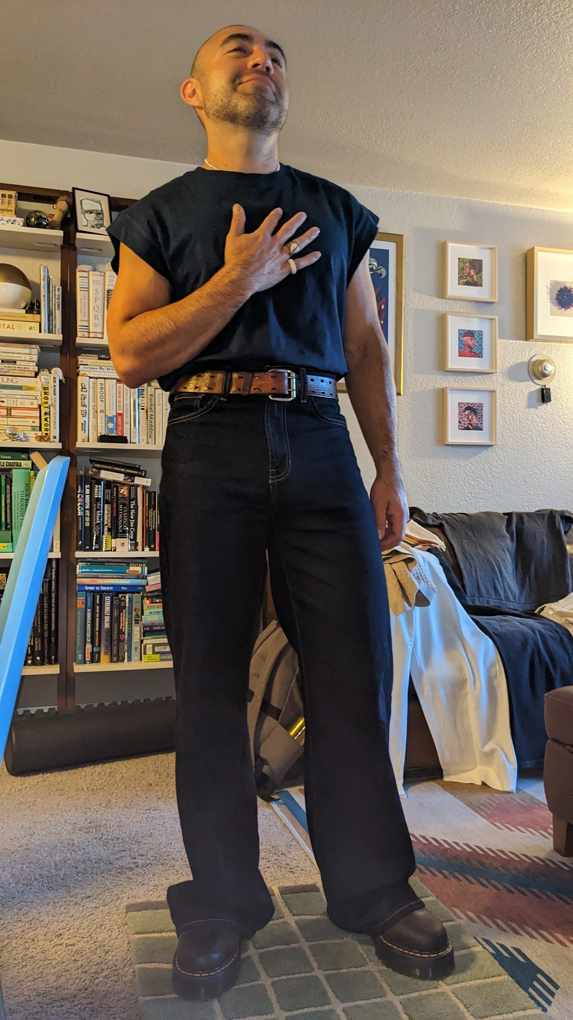 Jeff is precious. Muscle-bound short king, he was looking for ways to spice up his already-gender-expression-fluid wardrobe more for everyday and special occasions. He sat with some new ideas, and with time, he ventured out to experiment with (dare I say, fall in love with) unfamiliar silhouettes.